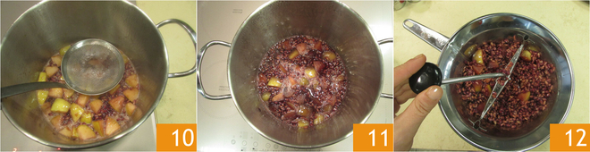 À medida que a espuma se formar, remova-a com uma escumadeira 10. Retire do fogo 11 e passe a mistura por um passador de alimentos para remover as sementes 12. Para essa operação, você também pode usar um mixer de imersão.