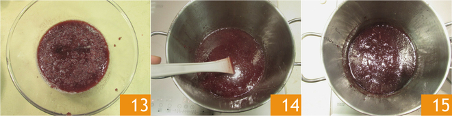 Recolha todo o suco 13 e coloque-o de volta na panela em fogo baixo, cozinhe por mais 50-60 minutos, mexendo frequentemente 14. A compota deve espessar 15.