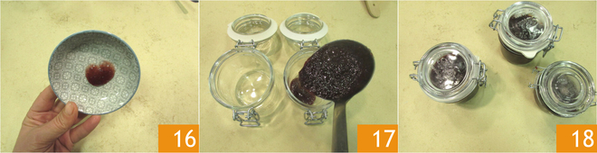 Verifique a consistência com o teste do pires. Coloque uma colher de chá de compota em um pires; se a mistura escorrer, significa que a compota precisa cozinhar mais, mas se permanecer firme 16, estará pronta. Transfira a compota ainda quente para potes que você esterilizou 17, ajudando-se com uma concha e cuidando para deixar 1 centímetro de espaço da borda. Feche os potes e deixe-os esfriar 18. Você pode virá-los de cabeça para baixo ou evitar essa etapa: graças ao calor, o vácuo será criado de qualquer forma, permitindo que o produto se mantenha por muito tempo. A compota de romã está pronta.