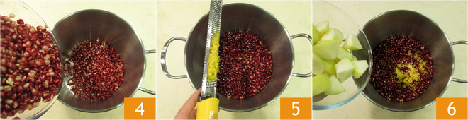 Coloque as sementes de romã em uma panela grande 4, aromatize com a casca de limão 5 e adicione também a maçã 6.