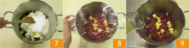 Adicione o açúcar 7, cubra com filme plástico 8 e deixe macerar por uma noite. Após o tempo de descanso, adicione o suco de limão 9 e cozinhe por cerca de 40 minutos em fogo baixo.