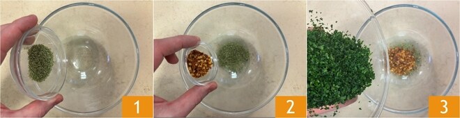 Para preparar o contrafilé de boi com legumes e molho chimichurri, comece pelo molho: em uma tigela, misture o orégano seco 1, a pimenta seca triturada 2 e a salsinha finamente picada 3.