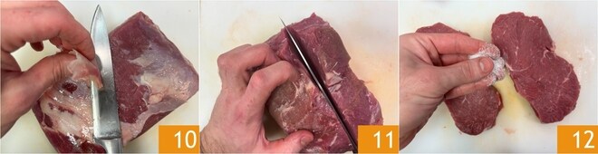Enquanto isso, prepare a carne: remova a membrana do contrafilé 10, depois corte em fatias de cerca de 4 cm de espessura 11. Salgue 12 e deixe repousar à temperatura ambiente por cerca de 30 minutos para intensificar o sabor.