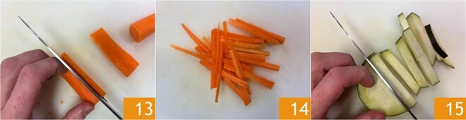 Passe para os legumes: limpe e corte as cenouras em fatias 13 e depois em tiras finas 14. Faça o mesmo com as berinjelas, fazendo tiras um pouco mais grossas, pois cozinharão em menos tempo 15.