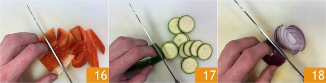 Corte também o pimentão em tiras do mesmo tamanho das berinjelas 16. Corte as abobrinhas em rodelas de 1 cm de espessura 17 e, por fim, corte as cebolas em meia-lua 18.