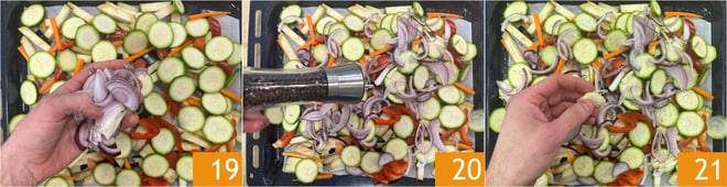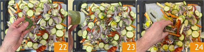 Aromatize com tomilho e alecrim 22, depois regue com um fio de óleo 23 e misture com as mãos para temperar os legumes uniformemente 24. Cozinhe em forno ventilado pré-aquecido a 200° C por cerca de 25-30 minutos.