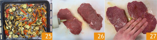 Quando os legumes estiverem cozidos 25, retire do forno e cuide do contrafilé: tempere as fatias com um fio de óleo 26 e massageie em ambos os lados 27.