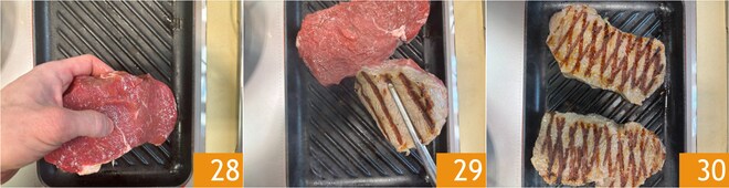 Aqueça uma grelha de ferro fundido no fogão. Quando estiver bem quente, coloque as fatias de carne 28 e cozinhe de ambos os lados 29 por um total de 5-6 minutos (cerca de 3 minutos de cada lado) 30; assim, você obterá uma cozimento médio.