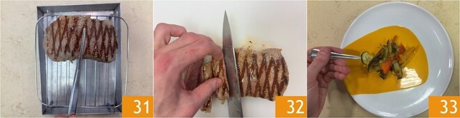Transfira o contrafilé para uma grade 31 e deixe descansar por 8 minutos, para que os sucos se redistribuam. Após o tempo de descanso, corte a carne em fatias 32 e monte o prato: distribua os legumes assados 33.