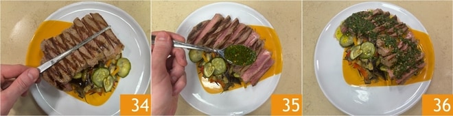 Coloque as fatias de carne sobre os legumes 34, depois regue com o molho chimichurri 35. Sirva imediatamente o seu contrafilé de boi com legumes e molho chimichurri 36!