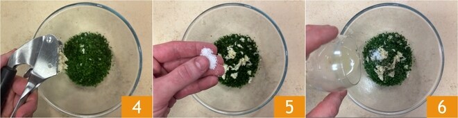 Esmague os dentes de alho, removendo o broto interno 4, depois adicione sal 5 e o suco de limão 6.