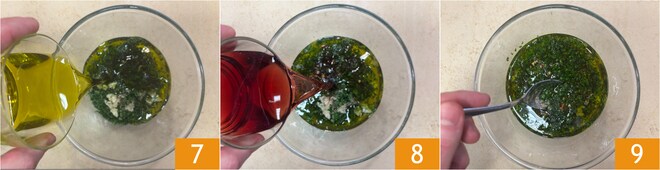 Adicione também o óleo 7 e o vinagre de vinho tinto 8, depois misture bem 9. Deixe repousar à temperatura ambiente por pelo menos 30 minutos para que os sabores se misturem.