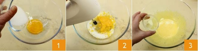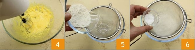continue misturando até obter uma mistura clara e espumosa 4. Em um recipiente à parte, coloque a farinha 5 e o fermento peneirados 6.