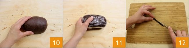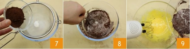 Adicione o cacau em pó 7 e misture com uma colher de chá 8. Despeje tudo na mistura à base de ovos, misturando com a batedeira elétrica 9, e então amasse à mão para juntar todos os ingredientes.