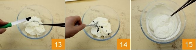 Em uma tigela grande, coloque o iogurte grego e as sementes da vagem 13, misturando bem com uma espátula para que as sementes se distribuam de forma homogênea e liberem seu aroma 14. Coloque o creme que você obteve 15 em um saco de confeitar sem bico, no qual você pode fazer um furo, e guarde na geladeira até o momento do uso.