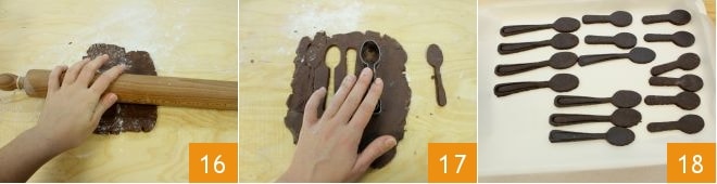 Após o tempo necessário, estenda a massa em uma superfície de trabalho enfarinhada com a ajuda de um rolo 16 (ou entre duas folhas de papel manteiga), criando uma folha com cerca de 0,5 cm de espessura. Corte a massa com um cortador ligeiramente enfarinhado em forma de colher 17: com essas quantidades, devem-se obter 16 biscoitos 18; distribua os biscoitos em uma assadeira forrada com papel manteiga e asse em forno estático pré-aquecido a 180° por 10 minutos (ou em forno ventilado a 160° por 8 minutos).