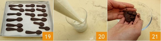 Ao término da cocção, retire os biscoitos de massa sablé do forno 19, deixando-os esfriar completamente sobre uma grade. Assim que o creme de iogurte estiver firme, retire-o da geladeira e monte as sobremesas: distribua o creme em 4 copinhos de servir com capacidade de 80 ml 20, depois esfarele parte dos biscoitos de cacau 21 e distribua sobre o creme para tornar a sobremesa mais saborosa e crocante;