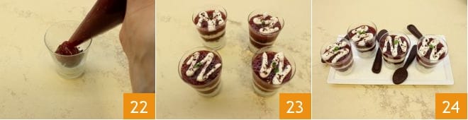coloque a geleia de morango em um saco de confeitar sem bico, no qual você fez um furo, e continue alternando a geleia e os outros ingredientes 22. Repita a operação para criar outra camada, então termine com uma decoração em zig zag, adicionando algumas migalhas de biscoito e uma folhinha de hortelã 23. Finalmente, acompanhe cada copinho com os biscoitos em forma de colher: seus copinhos com creme de iogurte, geleia de morango e biscoitos sablé de cacau estão prontos para serem servidos 24.