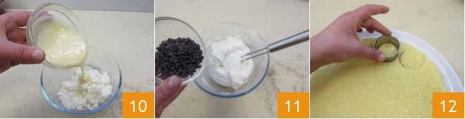 Adicione à ricota peneirada o leite condensado 10 e misture até obter um composto homogêneo. Acrescente as gotas de chocolate a este composto 11 e misture os ingredientes. O creme para os seus copinhos está pronto. Depois do tempo de cozimento do pão de ló, retire-o do forno e deixe esfriar. Quando atingir a temperatura ambiente, pegue um aro de 5 cm de diâmetro (para os discos do fundo do copo) e um de 8 cm (para os discos do meio do copo) 12. Sobrarão algumas sobras do pão de ló. Corte agora o pão de ló obtendo tantos discos quantos são os copinhos.
