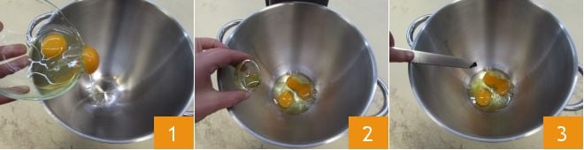 Para preparar os copinhos de cassata, comece com a preparação do pão de ló. Pegue os ovos em temperatura ambiente, quebre-os e coloque-os na batedeira 1. Adicione o mel aos ovos 2 e as sementes da fava de baunilha 3.