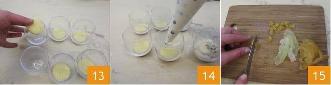 Agora comece a montagem dos copinhos. Pegue os copinhos e coloque no fundo o pão de ló de 5 cm de diâmetro 13. Com um saco de confeitar, despeje o creme de ricota e leite condensado previamente preparado 14. Pegue agora as frutas cristalizadas e corte-as em pequenos pedaços 15.