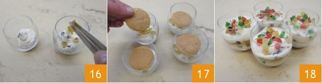 Adicione as frutas cristalizadas cortadas usando uma pinça 16 e, sobre elas, adicione um disco de 8 cm de pão de ló 17. Novamente com o saco de confeitar, recheie com o creme de ricota e leite condensado e depois com as frutas cristalizadas. Os copinhos de cassata estarão prontos para serem degustados 18!