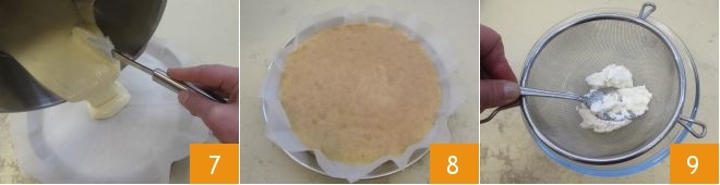 Em seguida, pegue uma assadeira de 32 cm e forre com papel manteiga. Despeje o composto na assadeira forrada 7 e nivele bem para que fique uniforme e o cozimento no forno seja homogêneo. Coloque a assadeira em forno estático pré-aquecido a 165°C por cerca de 15 minutos. No final do cozimento, o composto obterá uma coloração dourada 8. Enquanto o pão de ló está assando, prossiga com a preparação do creme para os seus copinhos de cassata. Peneire a ricota para torná-la ainda mais macia e cremosa 9.