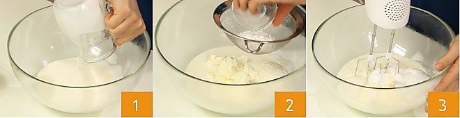 Para preparar os copinhos de pandoro e café, comece fazendo o creme de mascarpone e creme de leite: em uma tigela bem fria, despeje o creme de leite, também bem frio, 1, o mascarpone e o açúcar de confeiteiro peneirado 2. Bata tudo com uma batedeira elétrica 3.