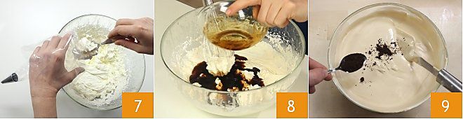 Retome o creme de mascarpone e reserve duas colheres de sopa que serão usadas para a decoração final dos copinhos: nós o transferimos diretamente para um saco de confeitar com bico em forma de estrela 7. Adicione o café morno ao creme restante 8 e misture para incorporar tudo. Adicione um pouco de pó de café ao creme: uma pitada de colher de chá é suficiente, mas se preferir, pode colocar mais 9. O creme deve ficar homogêneo e macio.