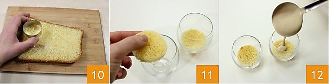 Neste ponto, corte, de fatias de pandoro com cerca de 1 cm de espessura, a base dos copinhos com um cortador de cerca de 5 cm de diâmetro 10 (o diâmetro e a altura da base podem variar de acordo com o copinho que você usar, ajuste conforme necessário). Você também pode compor a base com pandoro esfarelado. Coloque o pandoro no fundo dos seus copinhos 11 e cubra com uma concha de creme de café 12; você também pode alternar mais fatias de pandoro com o creme.