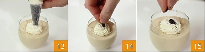 Para finalizar, esprema no centro dos copinhos um montinho de creme com o saco de confeitar 13 e coloque sobre ele um grão de café 14. Polvilhe os copinhos com uma pitada de pó de café 15 e voilà: seus copinhos de pandoro e café estão prontos para serem degustados!