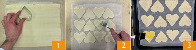 Para preparar os coraçõezinhos de massa folhada com framboesas e creme de avelã, estenda o primeiro rolo de massa folhada sobre a superfície de trabalho e, com um cortador de biscoito em forma de coração de cerca de 7x7 cm, corte cerca de 12-14 coraçõezinhos 1. Fure-os com os dentes de um garfo 2 e disponha-os em uma assadeira forrada com papel manteiga. Bata o ovo com água e use essa mistura para pincelar os corações 3.