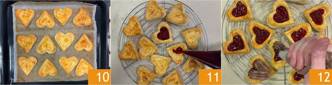 Depois de dourados, retire os coraçõezinhos do forno e deixe-os esfriar completamente 10. Quando a massa folhada estiver fria, transfira os coraçõezinhos para uma grade e, com a ajuda de um saco de confeitar, distribua dentro de cada cestinha uma camada de geleia, suficiente para cobrir o fundo 11. Depois, esprema um montinho de creme de mascarpone em cada coração de massa folhada 12.