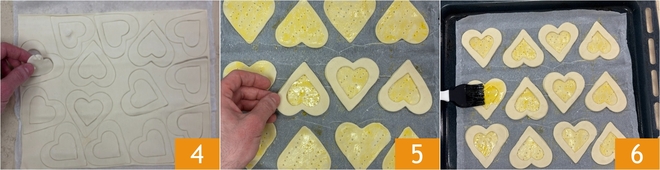 Desenrole também o segundo e o terceiro rolo de massa e corte mais 12-14 coraçõezinhos de cada um usando o mesmo cortador, depois fure-os no centro com um cortador menor em forma de coração de cerca de 4x4 cm 4 e remova o coraçãozinho interno de massa. Sobreponha então dois corações furados em cada base inteira, alinhando-os bem, para criar uma borda mais alta que formará a cestinha de massa folhada 5. Pincele a borda sempre com água e ovo 6.