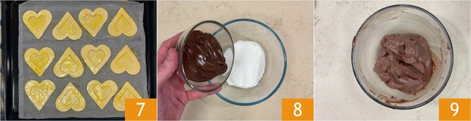 Quando suas cestinhas estiverem prontas, asse-as em forno estático pré-aquecido a 190 °C por cerca de 20 minutos, colocando a assadeira na prateleira mais baixa. Em uma tigela, misture o mascarpone com o creme de avelã 8 mexendo com uma espátula até obter um creme liso e homogêneo 9; transfira-o para um saco de confeitar com bico canelado.