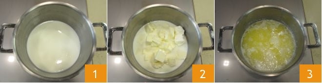 Para preparar o cornbread, você precisará preparar separadamente ingredientes líquidos e em pó e depois misturá-los juntos por último. Este método é chamado de "método muffin". Em uma panela, comece a aquecer o leite 1 e adicione a manteiga em pedaços 2. Você deve aquecer a mistura até que a manteiga esteja derretida 3.