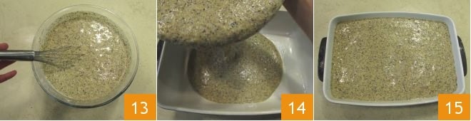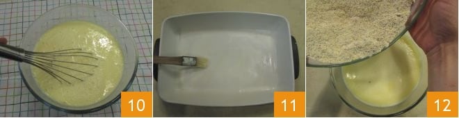 Dessa forma, o ovo chegará à mesma temperatura da mistura de manteiga e leite sem coagular 10. Pré-aqueça o forno a 170° em modo ventilado e unte uma forma retangular de 30,5x22,5 11; uma vez misturadas as composições líquidas, você pode despejar os pós todos juntos na mistura líquida de ovos, manteiga e leite 12,