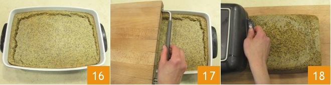 Quando estiver assado, retire o cornbread do forno 16, deixe esfriar um pouco e depois coloque uma tábua em cima para virar a forma 17; retire delicadamente a forma 18,