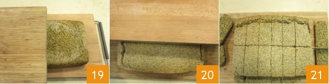 então coloque outra tábua ou um prato de servir retangular em cima do cornbread 19 e vire novamente 20. Corte o cornbread em vários retângulos para servir 21.