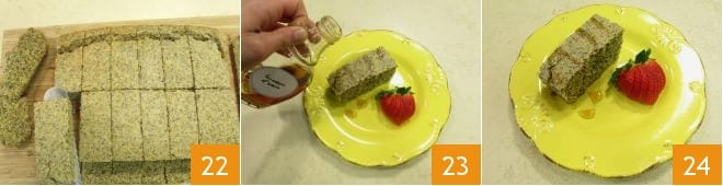 Geralmente, deste rico e saboroso pão consome-se um pedacinho 22, que pode ser temperado na versão doce com frutas frescas e xarope de bordo 23; nós, por exemplo, escolhemos morangos. Seu cornbread está pronto para ser servido como sobremesa 24, ou simples para enriquecer a cesta de pães!