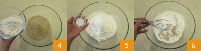 Enquanto isso, em uma tigela, coloque a farinha 00 e a farinha de milho negra 4, depois o fermento instantâneo para preparações salgadas e o sal 5. Você deve misturar tudo cuidadosamente com um batedor 6.