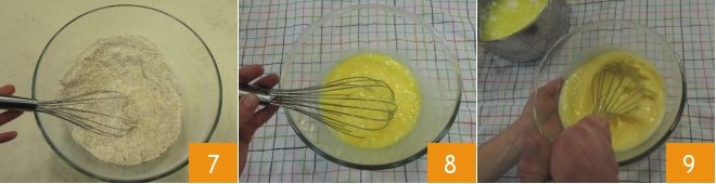 Essa fase é muito importante para que o fermento se distribua uniformemente 7, para obter um pão com cozimento uniforme, sem partes mais altas ou mais baixas. Em outra tigela, coloque os ovos e bata-os 8. Agora é hora de adicionar o leite e a manteiga quentes à mistura de ovos. Para evitar que o ovo cozinhe e se crie o efeito "omelete", espere alguns minutos; em seguida, coloque um pano seco sob a tigela com os ovos batidos, pegue o batedor e despeje lentamente a mistura quente de leite e manteiga, mexendo energicamente e de forma contínua 9.
