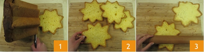 Para preparar a coroa de pandoro com Nutella®, comece cortando os primeiros 5 cm do pandoro que não serão usados 1. Em seguida, obtenha 4 fatias com 1,5 cm de espessura 2 e amasse 2 delas com um rolo de massa 3,