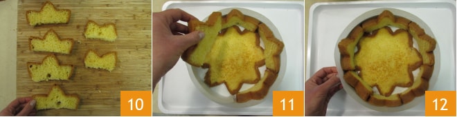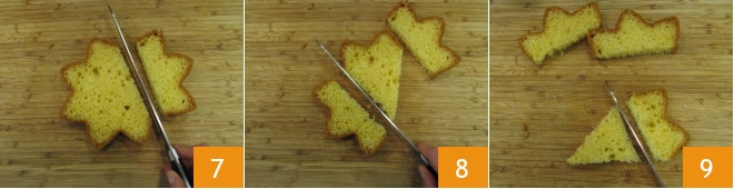 Com as fatias não tostadas, crie as pontas da coroa. Então, corte ao todo 4 pedaços com 3 7 pontas e 2 pedaços com 2 pontas 8, se necessário, ajuste-as de acordo com a forma e a espessura das fatias 9.