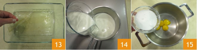 Enquanto isso, dedique-se ao creme. Mergulhe a gelatina em água fria, deve absorvê-la completamente 13, e enquanto amolece, despeje o creme de leite e o leite em uma panela 14 e leve à fervura. Em outra panela, coloque as gemas com o açúcar 15,