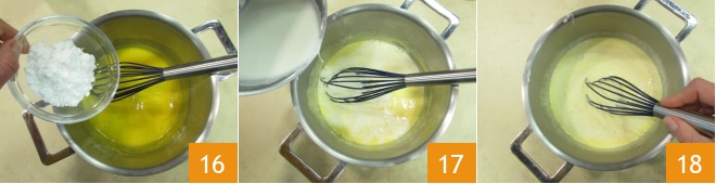 comece a misturar e depois adicione o amido de milho 16. Despeje lentamente o creme de leite e o leite já quentes 17 para obter uma mistura lisa 18.