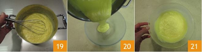 Coloque a panela no fogão. Cozinhe mexendo continuamente com um batedor até obter um creme liso 19. Então, transfira para uma tigela que você terá deixado resfriar no congelador 20 e mexa por alguns instantes para baixar a temperatura do creme 21.