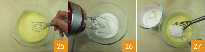 Misture e deixe esfriar por alguns minutos 25. Enquanto isso, despeje o creme de leite em uma tigela, bata, mas sem chegar ao ponto de neve firme, apenas mais macio 26, e adicione ao creme misturando delicadamente 27.