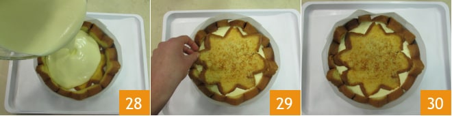 Despeje o creme na casca de pandoro 28, coloque a última fatia de pandoro tostada (se necessário, corte as pontas com uma forma um pouco menor que a forma) 29, coloque-a sobre o creme pressionando levemente para compactar. Deixe firmar na geladeira por pelo menos 4 horas 30.