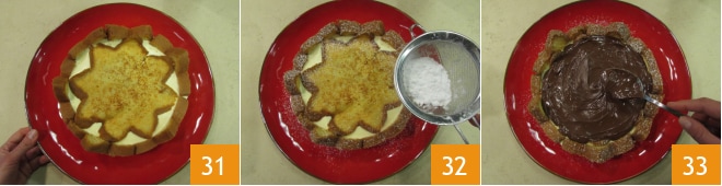 Recupere o bolo e transfira-o para um prato de servir 31. Polvilhe apenas as pontas com açúcar de confeiteiro 32. Então, espalhe Nutella® por toda a superfície 33,
